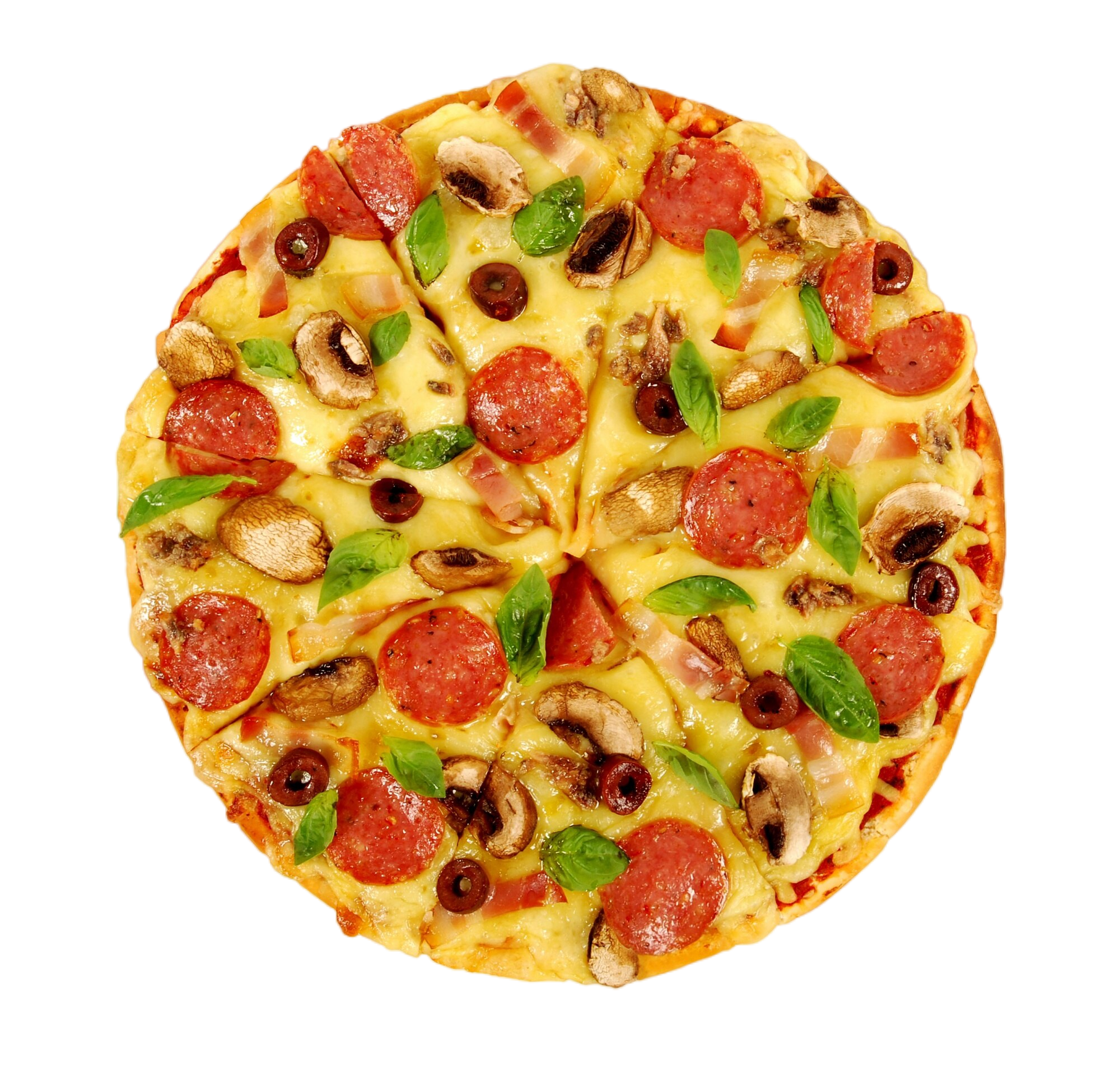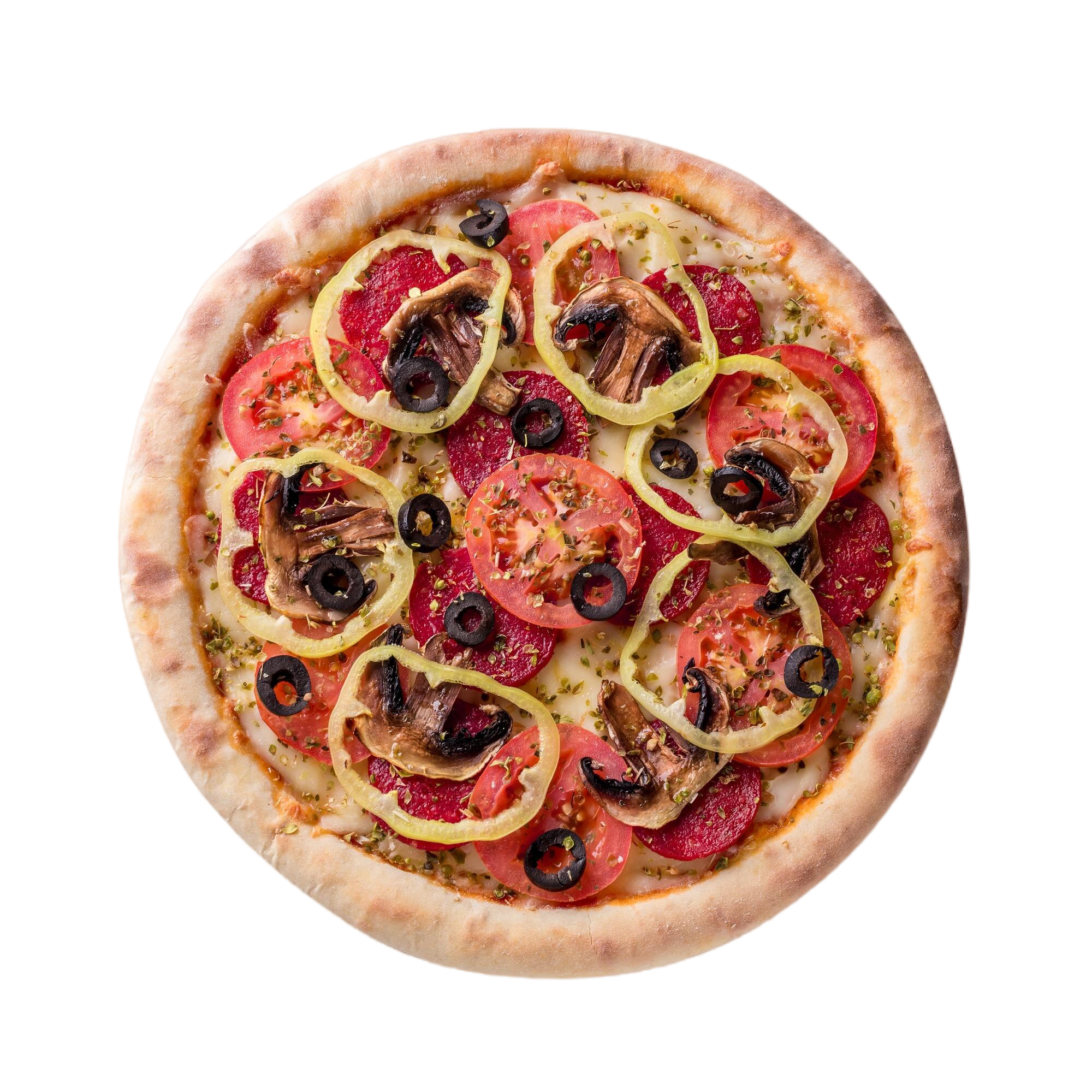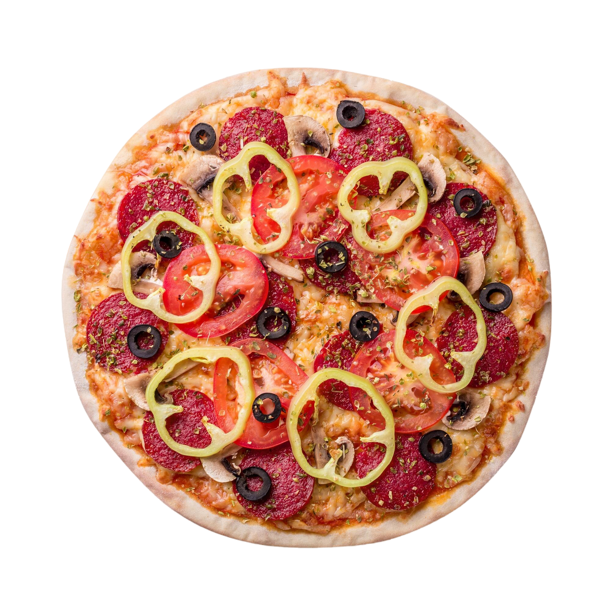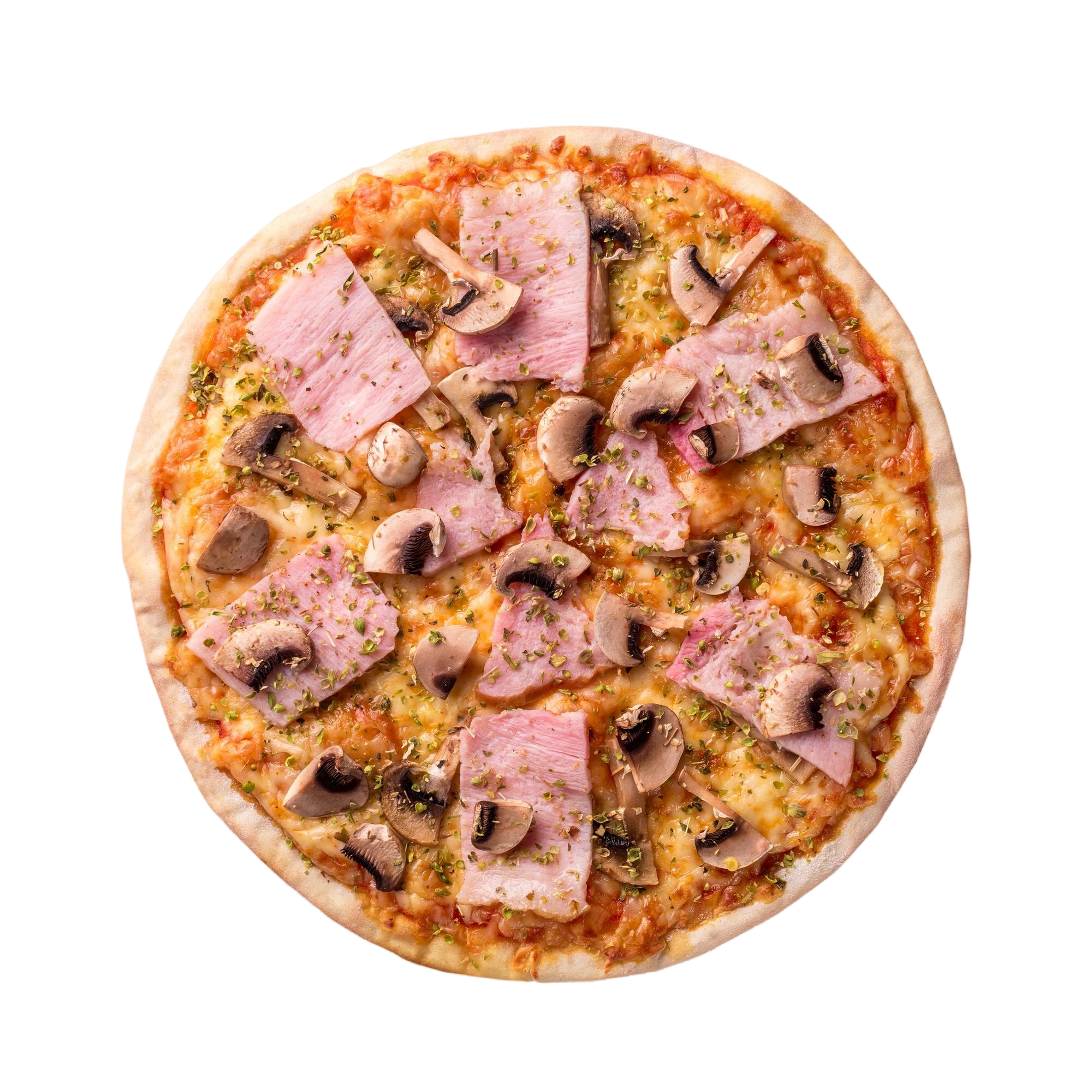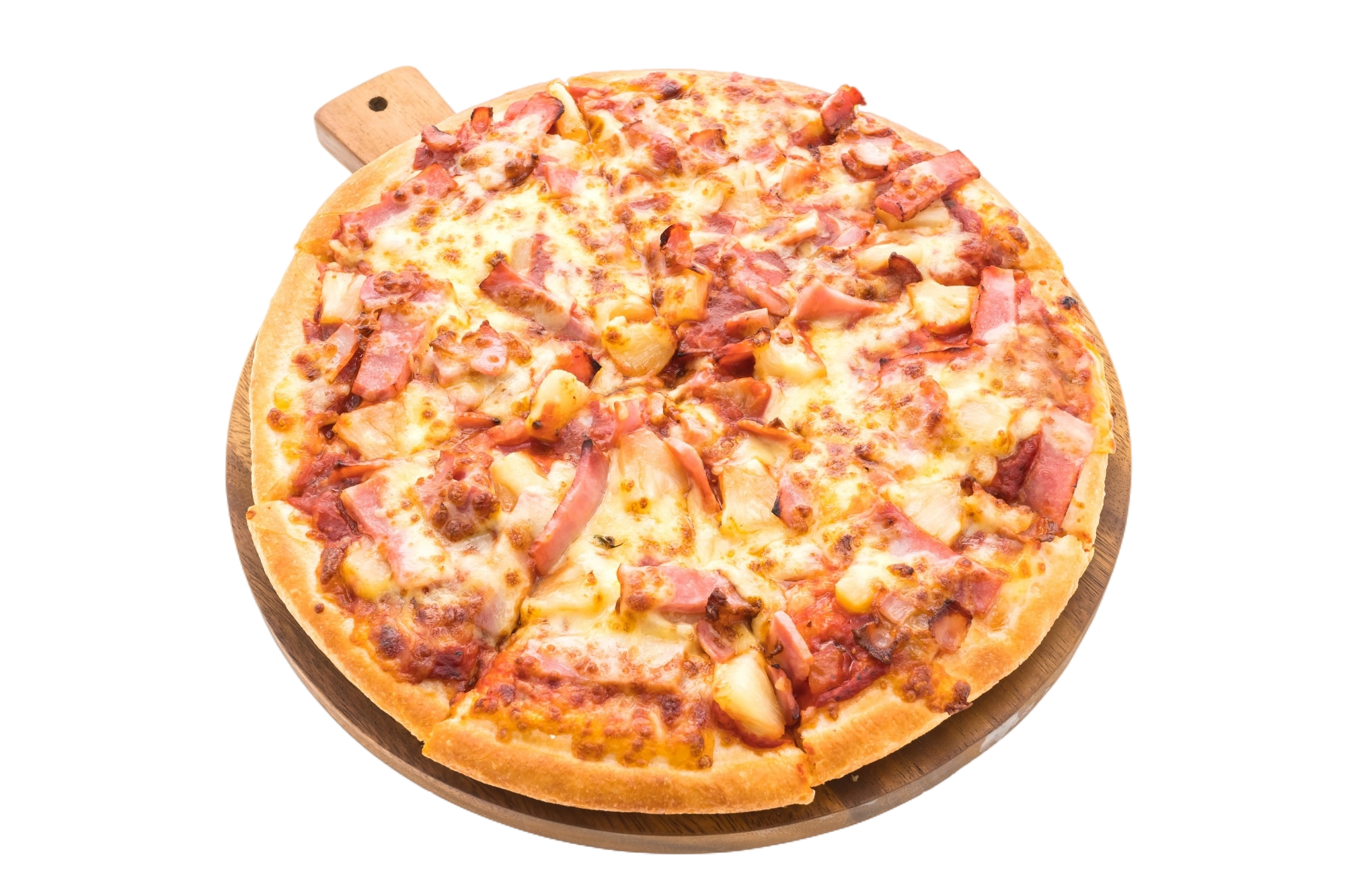 Jamón, salami, pimiento, chorizo, piña, champiñón y salchicha